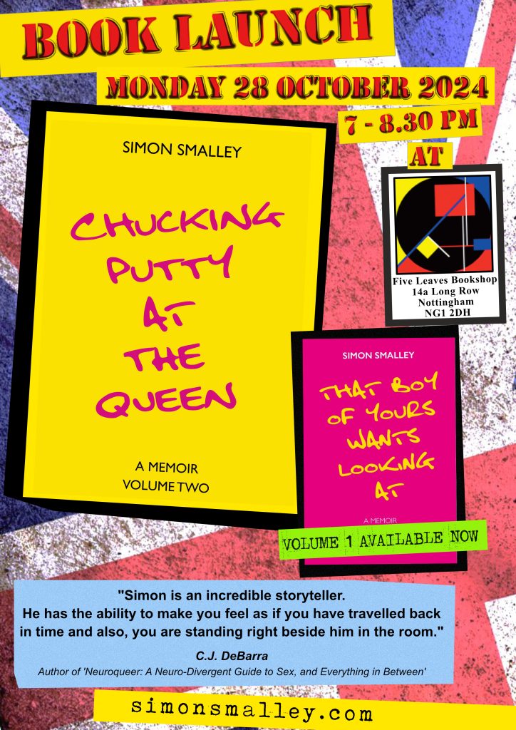 In ‘Chucking Putty At The Queen’ I wrote about my debut onto the Nottingham gay scene in January 1982 and it was with great fondness that so many of the assembled men told me how much they loved my descriptions of the social gatherings at Gay Switchboard, the cellar bar of the Hearty Goodfellow, and Part Two nightclub. It was fabulous to connect with men who remembered those days. Thanks, chaps!