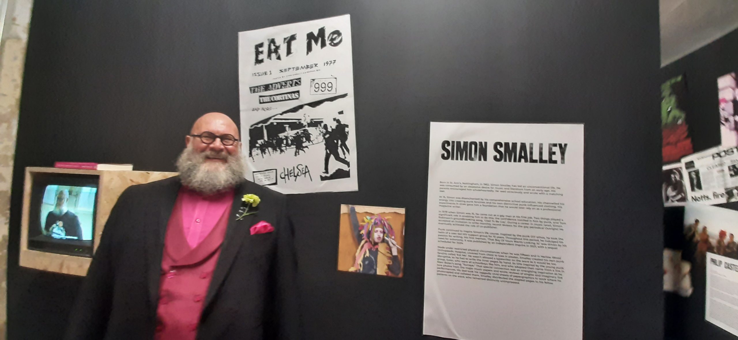 Illustrating my history of non-conformism, also displayed was a photo of me aged nine wearing one of my everyday wear comprising a home-made crepe paper wig, with glitter beneath my eyes, and a DIY feather boa looped around my neck. At the side of it is an enlarged cover of my ‘Eat Me’ fanzine, for which I hand drew the lettering based on the logo on the debut album by The Clash. As there were no capital E or M it meant that I had to design my own. I was honoured that, in homage to the fanzines I made when I was fifteen, the young arts collective ‘Pending’ created their own impressively super-sized ‘zine.’